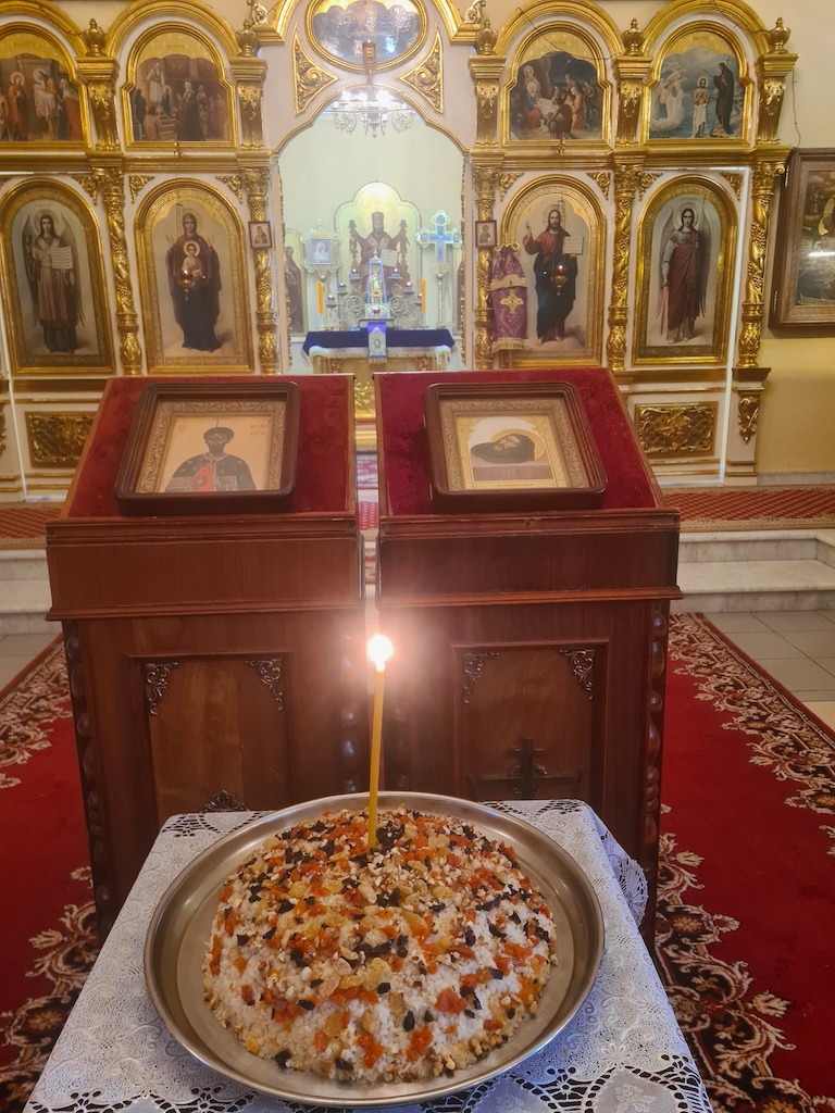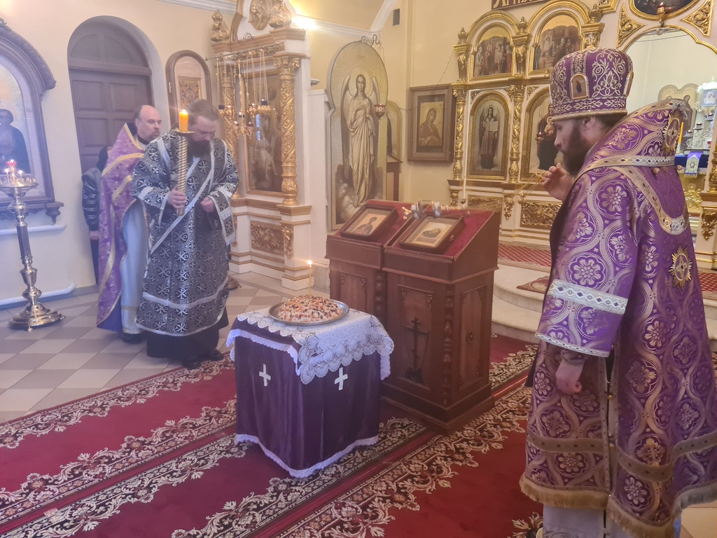 Затем Преосвященный Владыка совершил чин молебного пения великомученику Феодору Тирону и прочитал молитву над коливом.