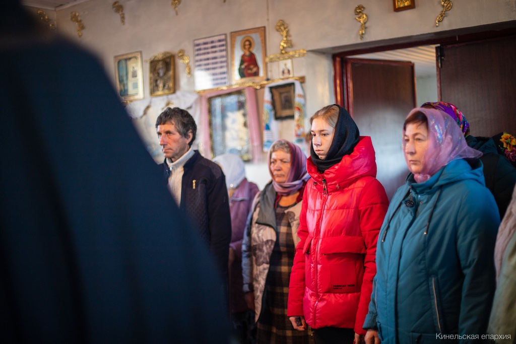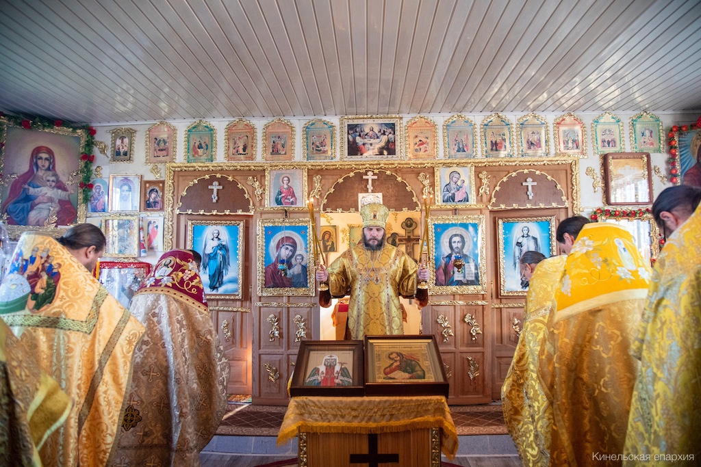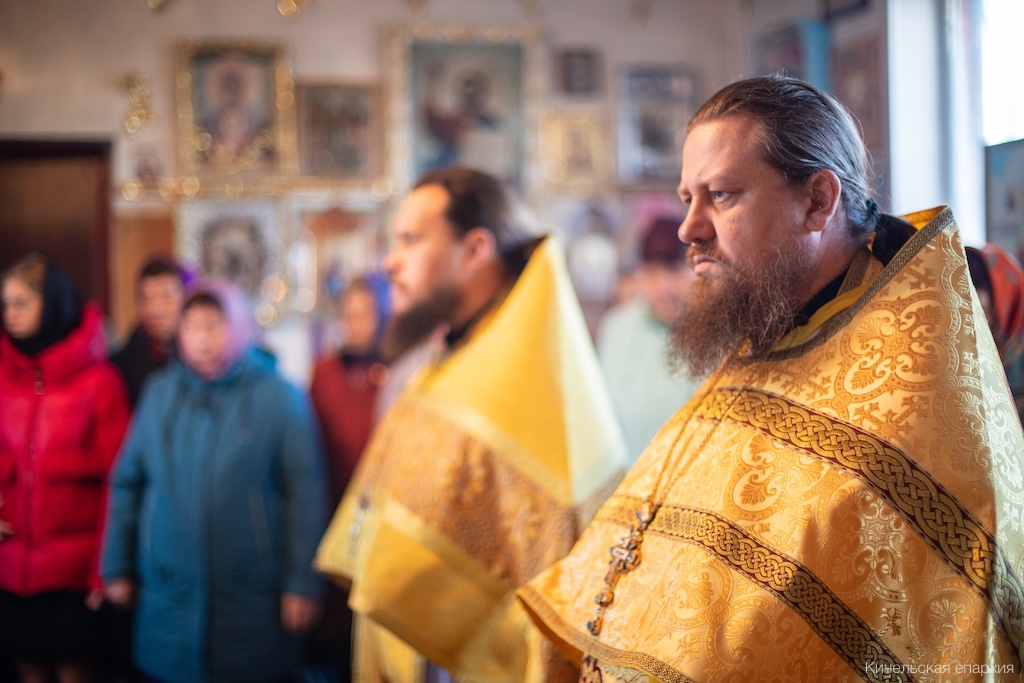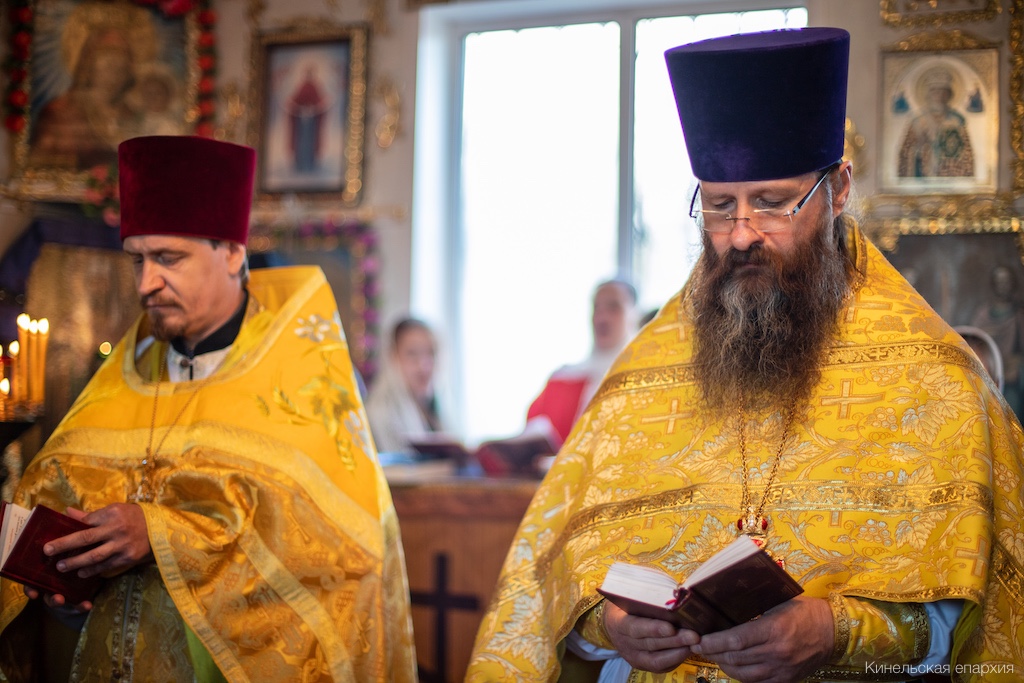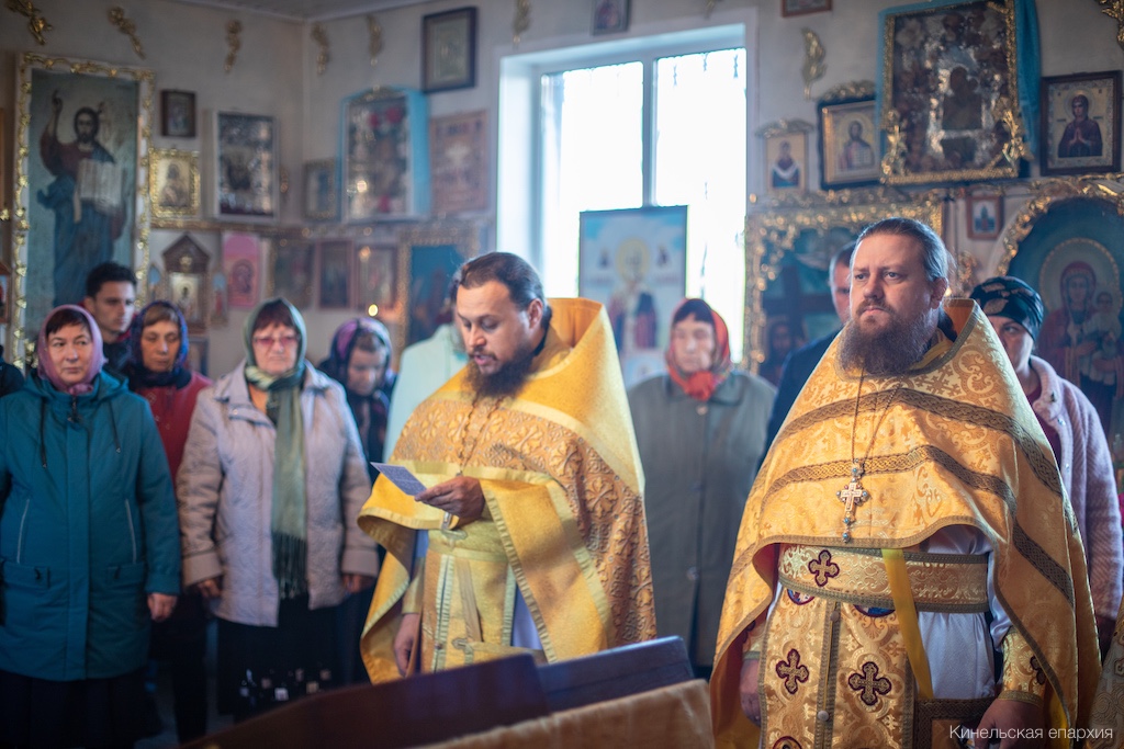 Его Преосвященству сослужили прот. Павел Пушкаренко, благочинный Алексеевского округа, прот. Николай Советкин, благочинный Нефтегорского округа, прот. Анатолий Копач, настоятель Троицкого храма с. Утевка, духовенство Кинельской епархии.