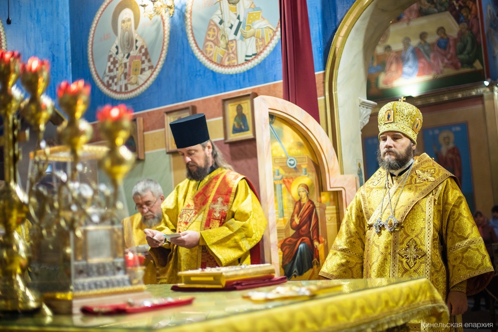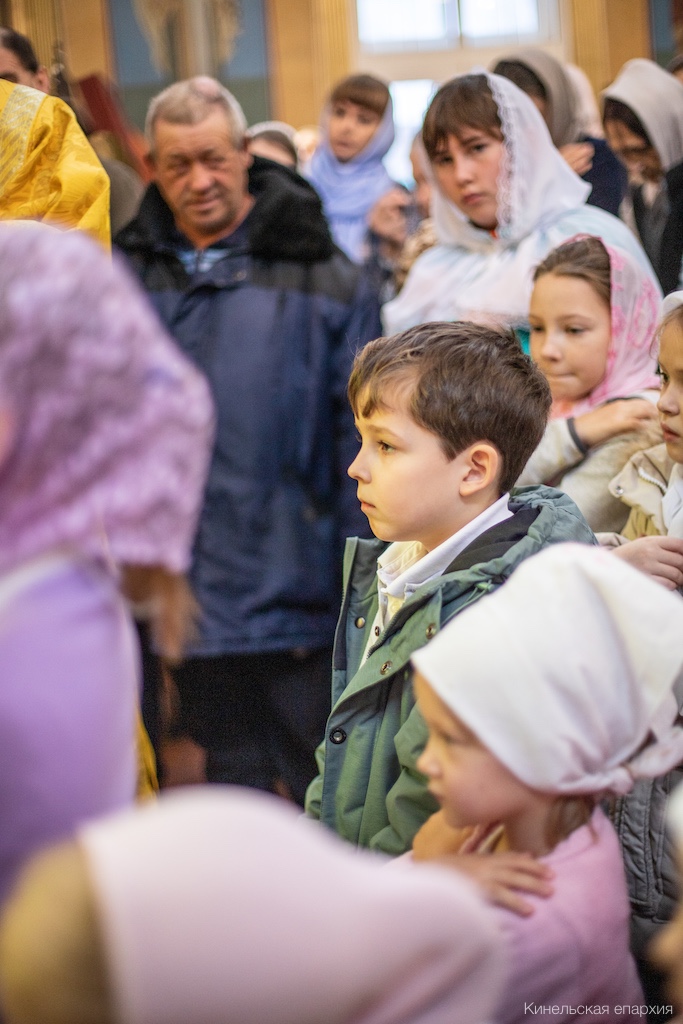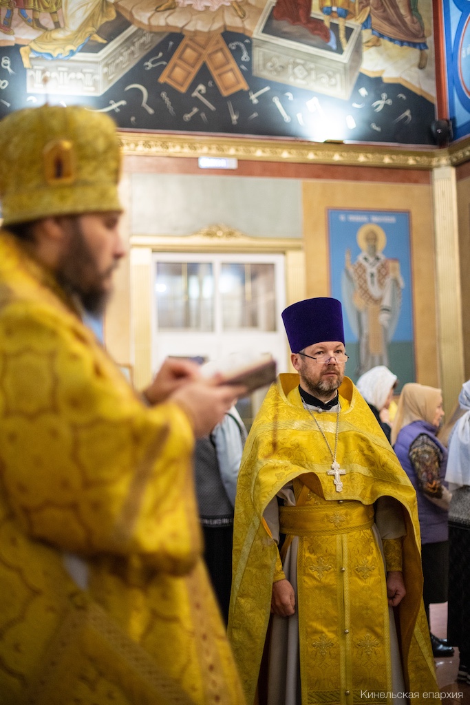 В Неделю 26-ю по Пятидесятнице, Предпразднство Введения во храм Пресвятой Богородицы, Преосвященный Софроний, епископ Кинельский и Безенчукский, совершил Божественную литургию в кафедральном соборе г. Кинеля.