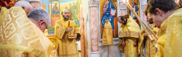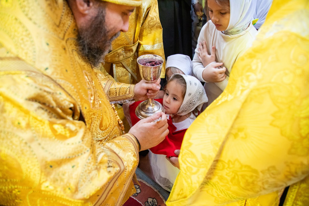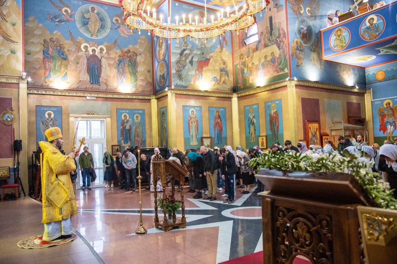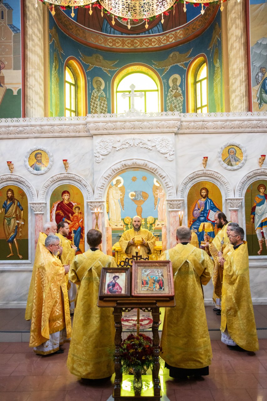 Его Преосвященству сослужили клирики собора. На сугубой ектении епископ Софроний вознес молитву ко Господу о Святой Руси. Проповедь перед причастием произнес прот. Димитрий Свербягин.