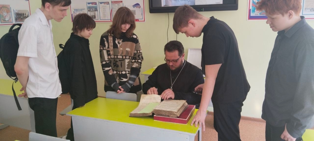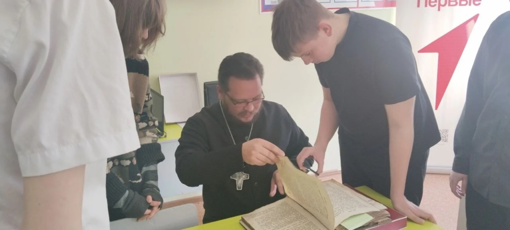 Девятиклассникам отец Илья рассказал об истории книгопечатания на Руси, уделив особое внимание первопечатной датированной книге — «Апостолу» Ивана Фёдорова. В качестве наглядного пособия был представлен фолиант 1834 года. Учащиеся смогли воочию увидеть, как оформлялись старопечатные издания, и даже прикоснуться к книге, которой почти двести лет.