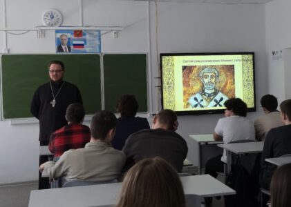 Отец Илья провел увлекательную лекцию о жизни и подвиге святых равноапостольных братьев Кирилла и Мефодия — небесных покровителей славянской письменности и просвещения. Учащиеся узнали об исторических обстоятельствах создания первых славянских азбук — глаголицы и кириллицы, а также о том, какое значение эти открытия имели для духовного и культурного развития славянских народов.